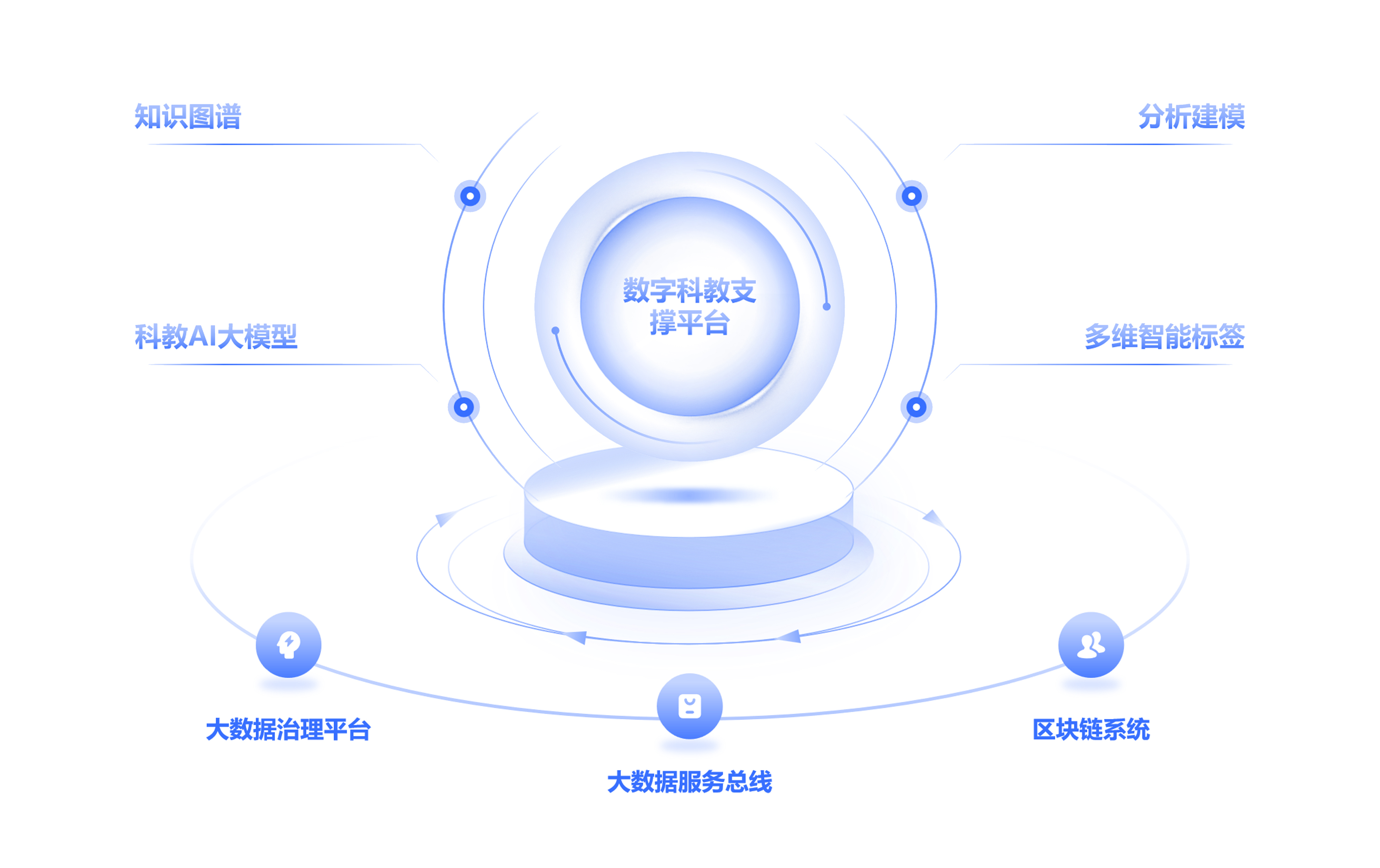 腾云大数据智能产品体系主要由大数据治理、建模和图谱、AI大模型支撑智能问答和科教智能导师系统,基于腾云数字科教支撑平台构建成熟的校外科教服务运营和科教联盟服务运营平台