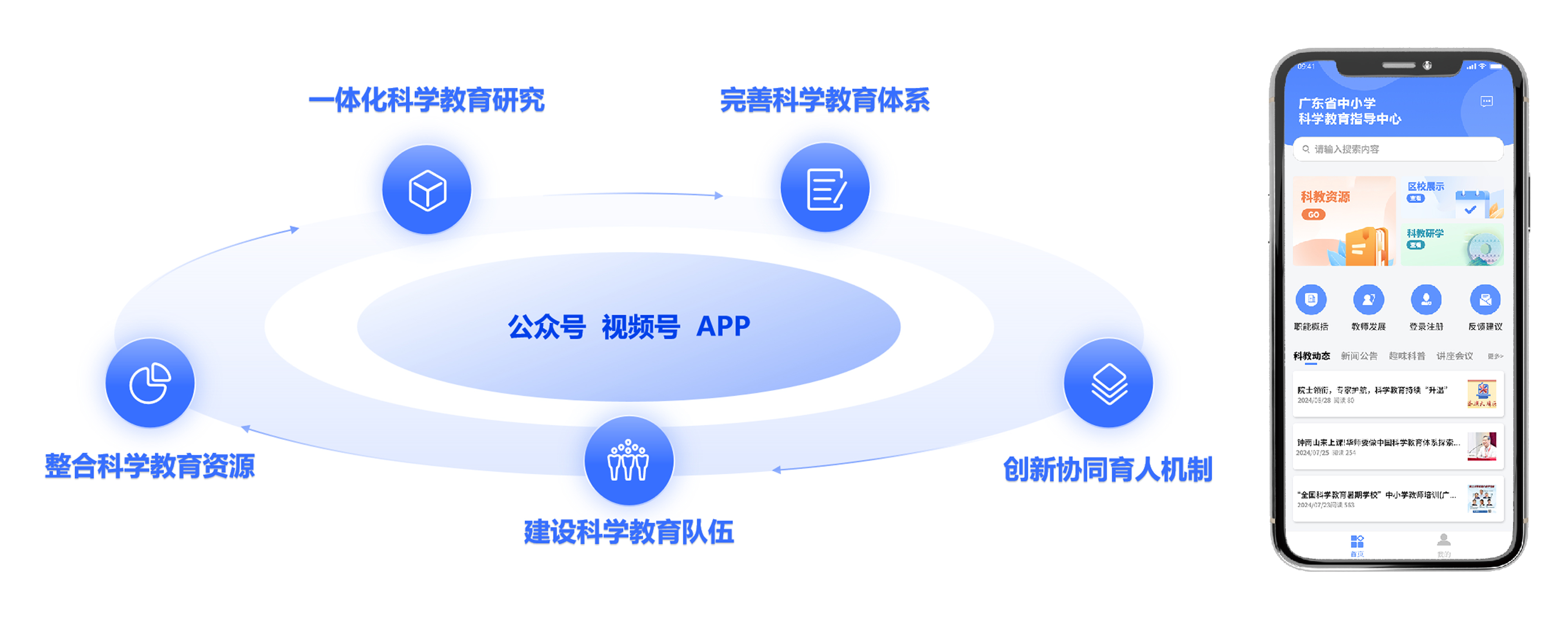 依托科教AI大模型,统一接入学校、教育局、学生和教育服务机构 ,汇聚科教资源,基于数字科教支撑平台构建提供各种场景服务的校外科教运营平台,以及为科教联盟、科普专委会提供线下合作运营的科教联盟服务平台